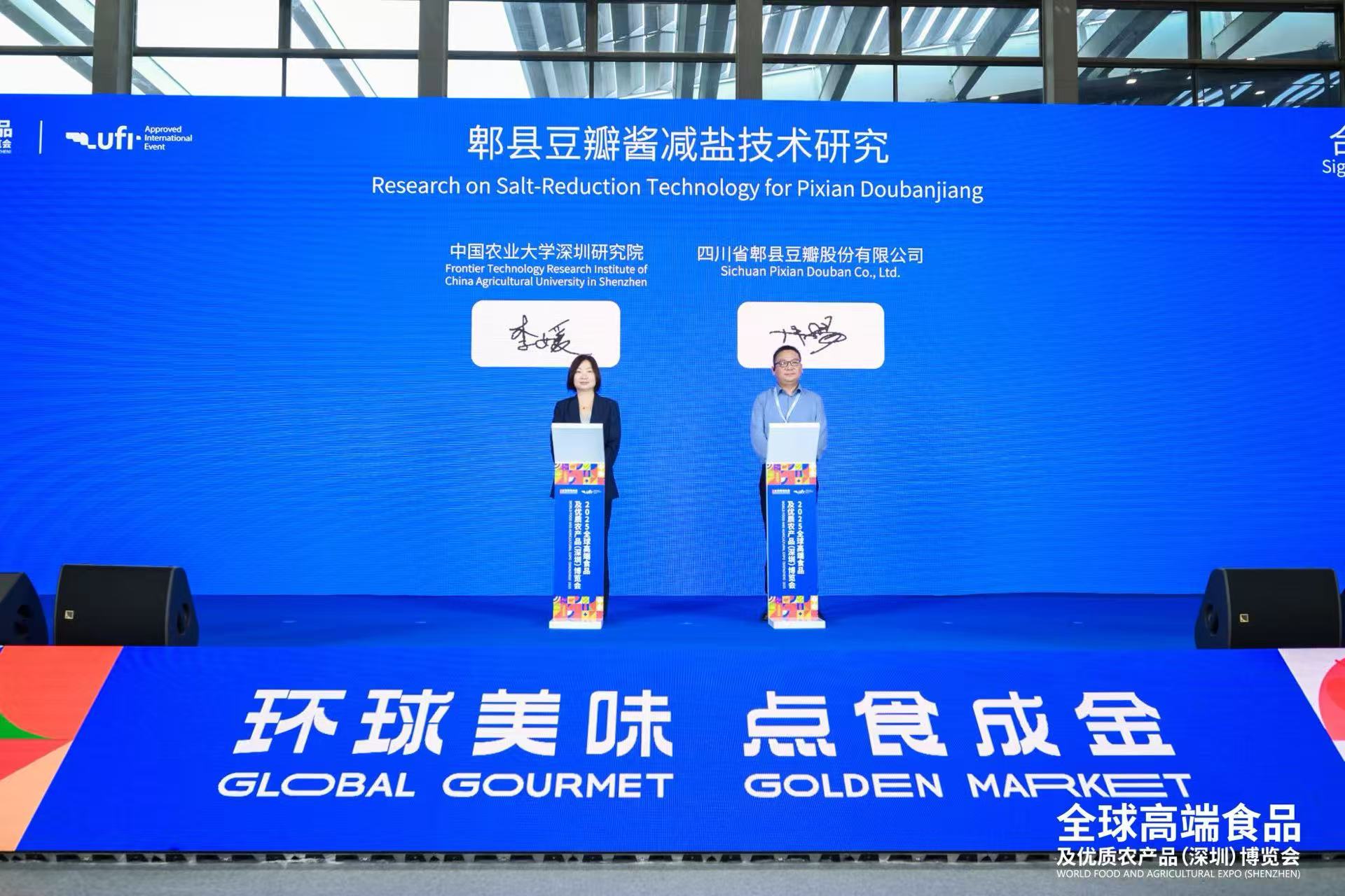 在开幕仪式上,鹃城牌郫县豆瓣公司总经理冉易与中国农业大学深圳研究院教授李媛签署了合作协议,双方将围绕郫县豆瓣酱减盐技术开展专项研究。此次合作是鹃城牌郫县豆瓣积极响应健康消费潮流、精准把握消费者对健康食品需求趋势的重要举措。通过产学研协同创新,双方将共同探索减盐工艺的优化路径,在充分保留郫县豆瓣独特风味的基础上,为传统调味品的现代化升级与健康化转型注入强劲的动力。