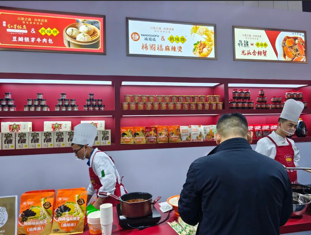 为了进一步提升现场人气与互动体验,鹃城牌郫县豆瓣联合杨国福、红星饭店、光头香辣蟹,在糖酒会现场别出心裁地设置了联合美食品鉴,酱香十足的香辣蟹、汤底醇厚的麻辣烫、风味十足的地道川菜、注入鹃城酱香风味的各种美食,合味成宴。吸引了大量专业观众与美食爱好者争相体验。美食集市不仅是一个品鉴区,更成为一个鲜活的场景化营销平台,让品牌与消费者在轻松愉悦的氛围中建立了更深的情感连接。